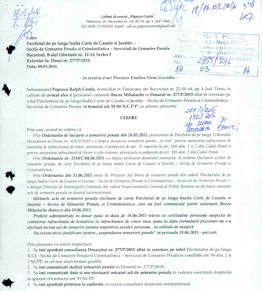 Cerere pentru incetarea suspendarii urmaririi penale din 14.03.2016