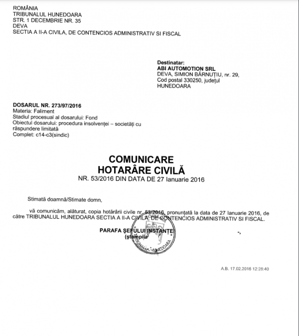 » Dosar nr. 273/97/2016 - Admitere Faliment