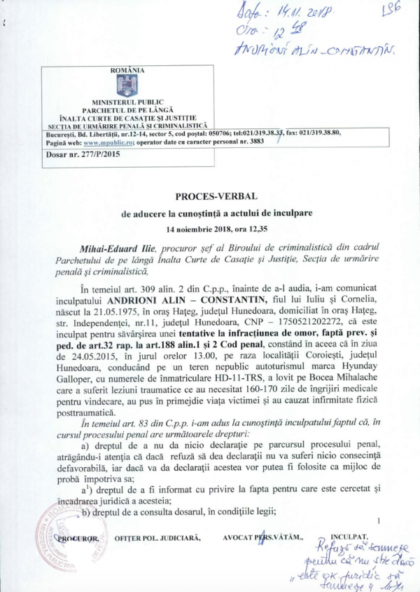Proces verbal de aducere la cunostinta a actului de inculpare 14.11.2018